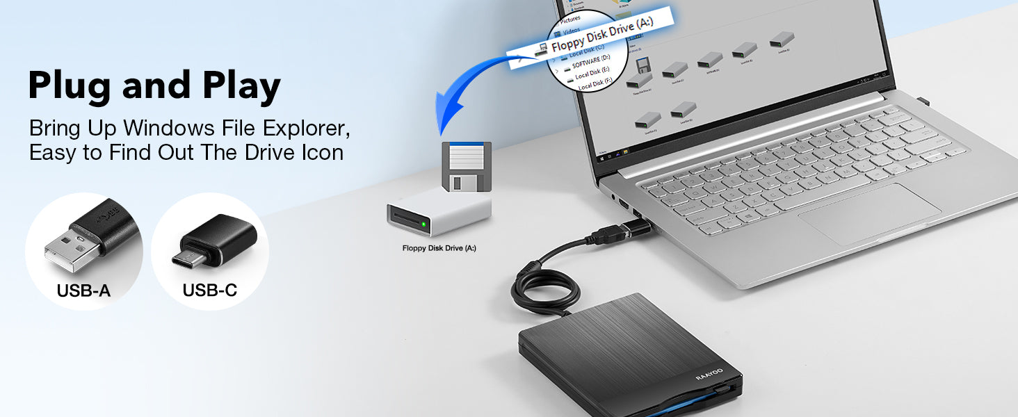 - Plug and Play Floppy Disc Reader: No extra driver required, then plug the USB connector to your computer and it will be automatically detected by your computer and install drive right now.